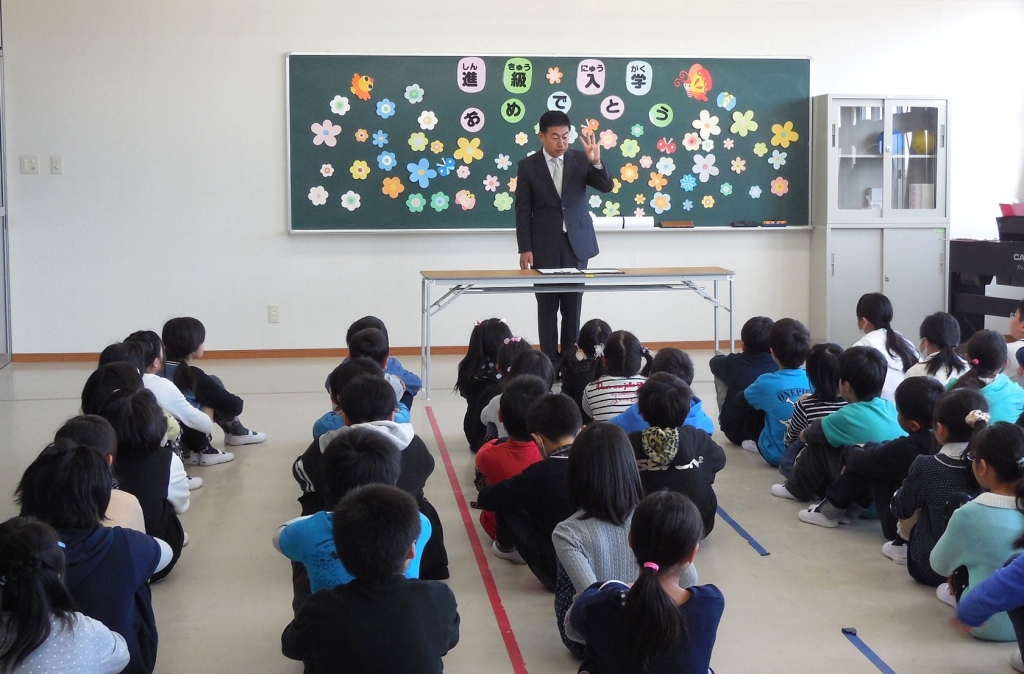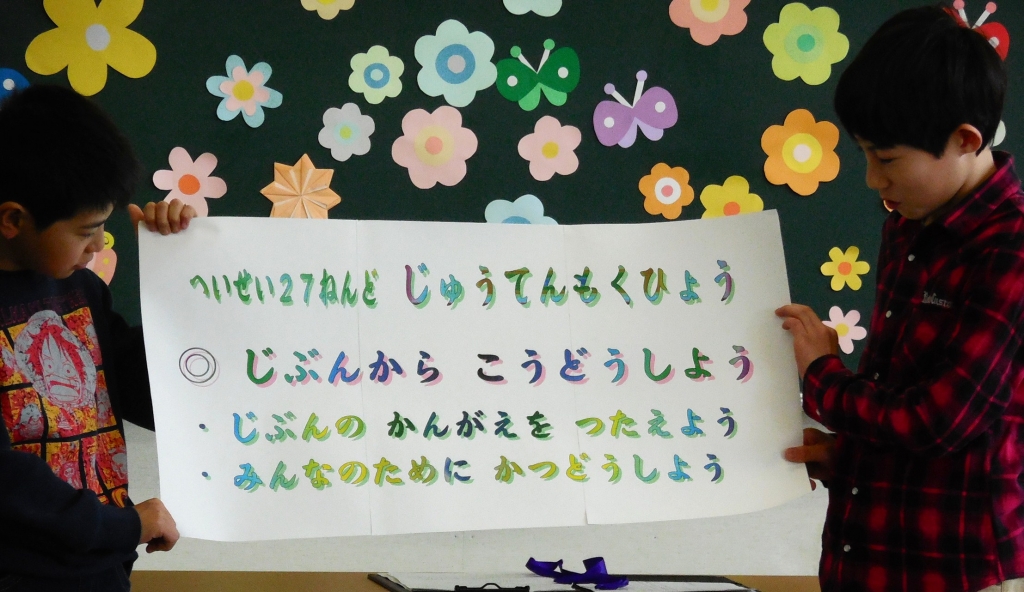 3校合同の始業式では、今年度の教育目標を確認しました。平成27年度の教育目標は、「自分から行動しよう」です。授業中でも、友達との関わりの中でも、ほんの少し勇気を出して、自分の思いを伝えられるようになってほしいです。