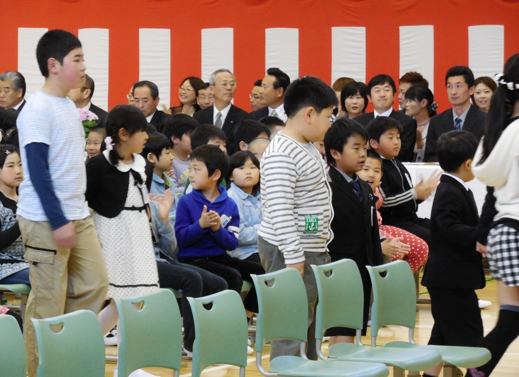 4年生と手をつなぎ、全校生で作る手のアーチをくぐって入場した1年生。入学式の凛々しい表情とはまた違い、緊張のほぐれた、かわいい笑顔での入場でした。