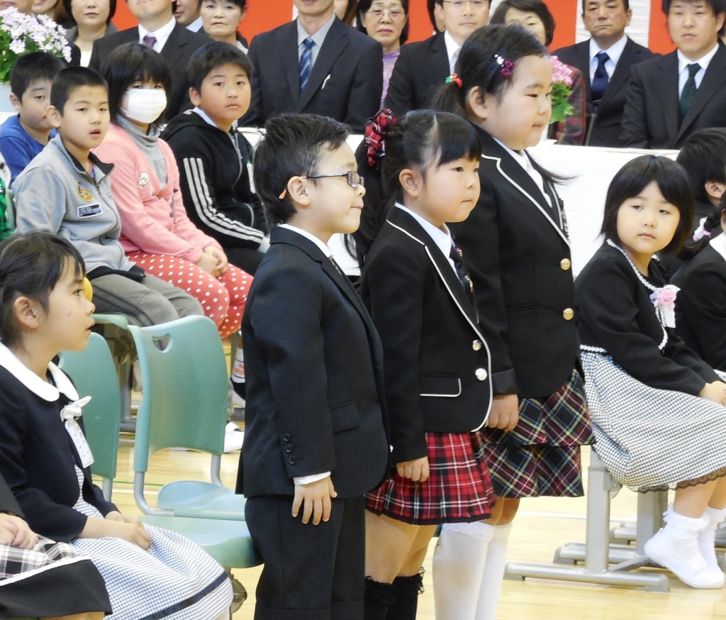 6年生と手をつないで入場した1年生。大きな拍手や、たくさんのお客さんやお兄さん・お姉さんに驚いた様子でしたが、自分の名前を呼ばれると、しっかり返事をすることができました。