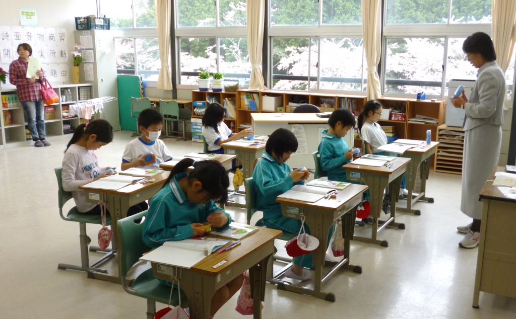 ある時刻から「○○時間後」の時刻や、時刻と時刻の間の「時間」を求めました。算数セットの時計を使って、実際に針を動かしながら真剣に考えることができました。