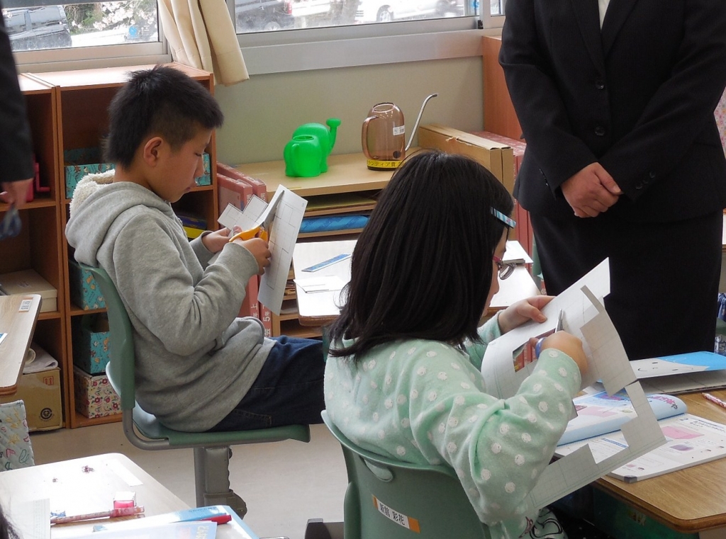 直方体と立方体を自分で作り、組み立てるとどちらの「かさ」が多くなるか話し合いました。展開図を自分で描き、組み立てる作業にも、ていねいに行っていました。友達との話し合いから、「体積」の基礎となる考え方を共有することができました。