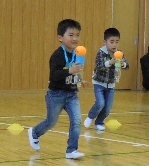 「ボール運びリレー」は、逆さまにしたペットボトルに、小さいボールを乗せて運ぶリレーでした。縦割りの清掃班で勝負し、本気になって応援する声が響きました。