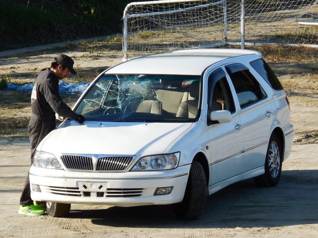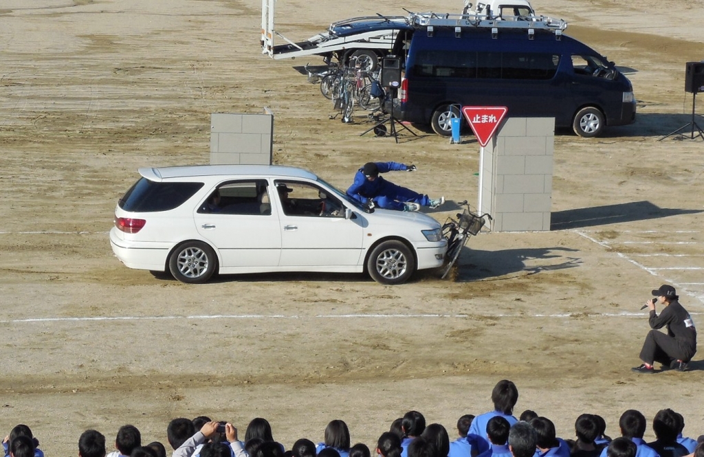 内容は、スタントマンによる交通事故の再現でした。交差点での事故や、車を降りるときのドアの開け方にも気をつけること、大型トラックの内輪差など、今まで知らなかったことをたくさん教えていただきました。