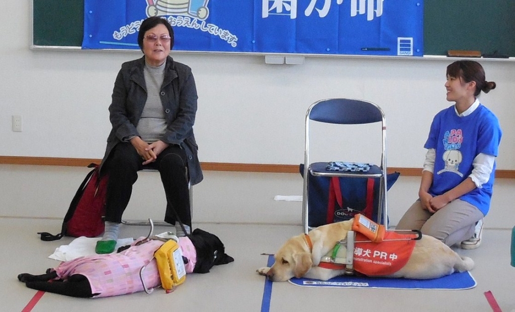 盲導犬協会の奥澤さんとPR犬のヘレンちゃん。南相馬市の山田さんとクローネちゃんです。山田さんは目が不自由で、クローネちゃんと5年間一緒に生活しているそうです。実際に生活していて苦労したことや、嬉しかったことなどを教えていただきました。