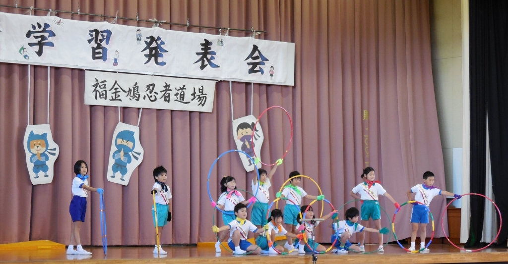 11人のかわいい忍者たち。一人前の忍者になるために、音読の技・音楽の技・身軽の技に挑戦します。詩の暗唱や演奏、マット運動。日頃の学習の成果をしっかり発揮することができました。最後は、フラフープを使ったダンス。息の合ったダンスに、道場長様は、全員の合格を認めてくださいました。