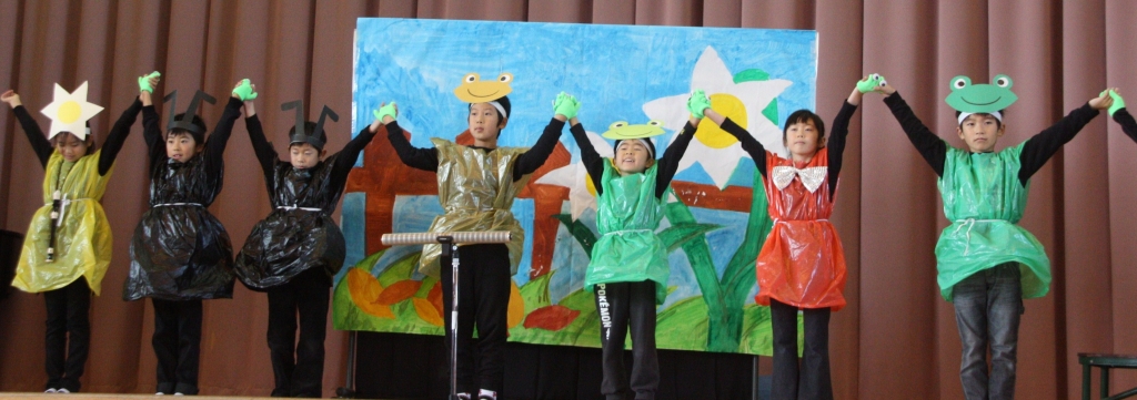 国語の教科書に出てくるお話を、10人の3年生がアレンジして演じました。習いたてのリコーダーで、3匹のかえるたちを無事起こすことができました。話題の「ようかい体操」や、手話の歌なども披露され、最後には、一人ひとりの個性を生かしたカーテンコール。全員が明るく楽しく演じていました。