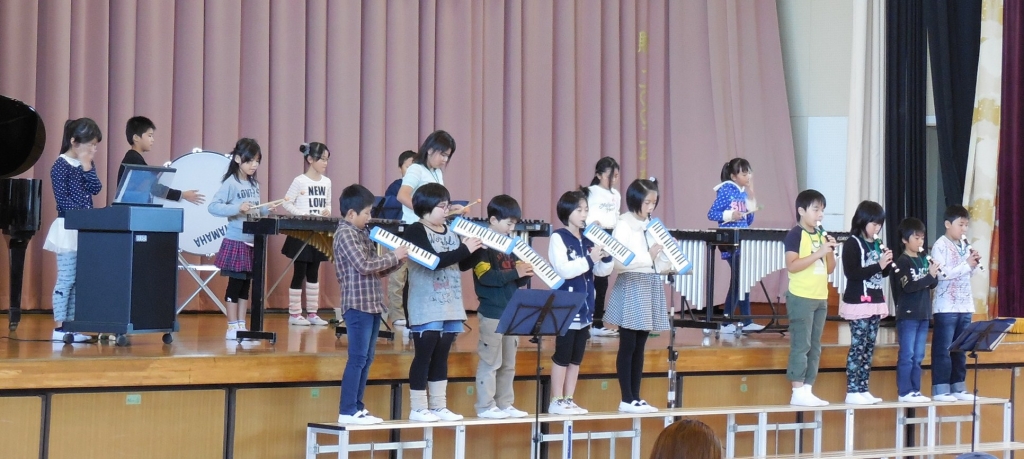 総合学習で学んだ、点字や手話の発表から始まった、盛りだくさんの発表。曲は「子どもの世界」「幸せなら手をたたこう」「Let It Go ~ありのままで~」の3曲です。毎日、朝や休み時間、放課後まで練習の音が響いていました。18人が心を一つに、すてきな演奏をすることができました。