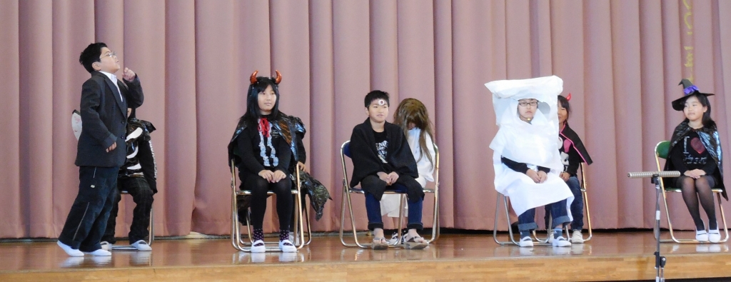 お化けにも学校があるんです。でも、お化け学校で学んだおばけの心構えは、人間の子どもにはかないませんでした。お化けと人間が、最後には仲良くなってしまいました。18人全員での「うーらーのーめーしーやー」、楽しい仮装と見事な演技で、会場を笑いにつつんでくれました。