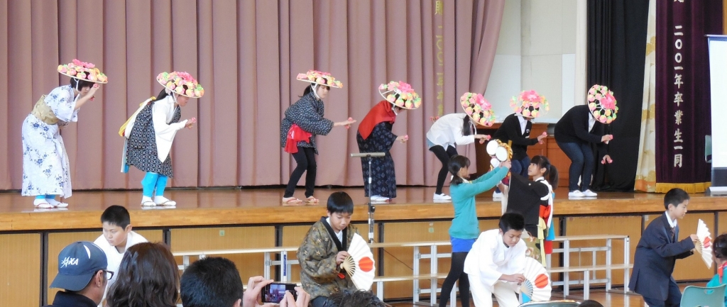 現代の子どもがタイムスリップをして、戦国の時代へ。関所を通る時には、本名を隠さなければいけなかったのですね。そして、宝財踊りや田植え踊りにはその時代の人々の願いがこめられていました。今でも受け継がれている伝統芸能を、本格的な衣装と踊りで見事に再現してくれました。さすが最高学年。19人の6年生は、最高の先輩として、下級生のあこがれの的となりました。