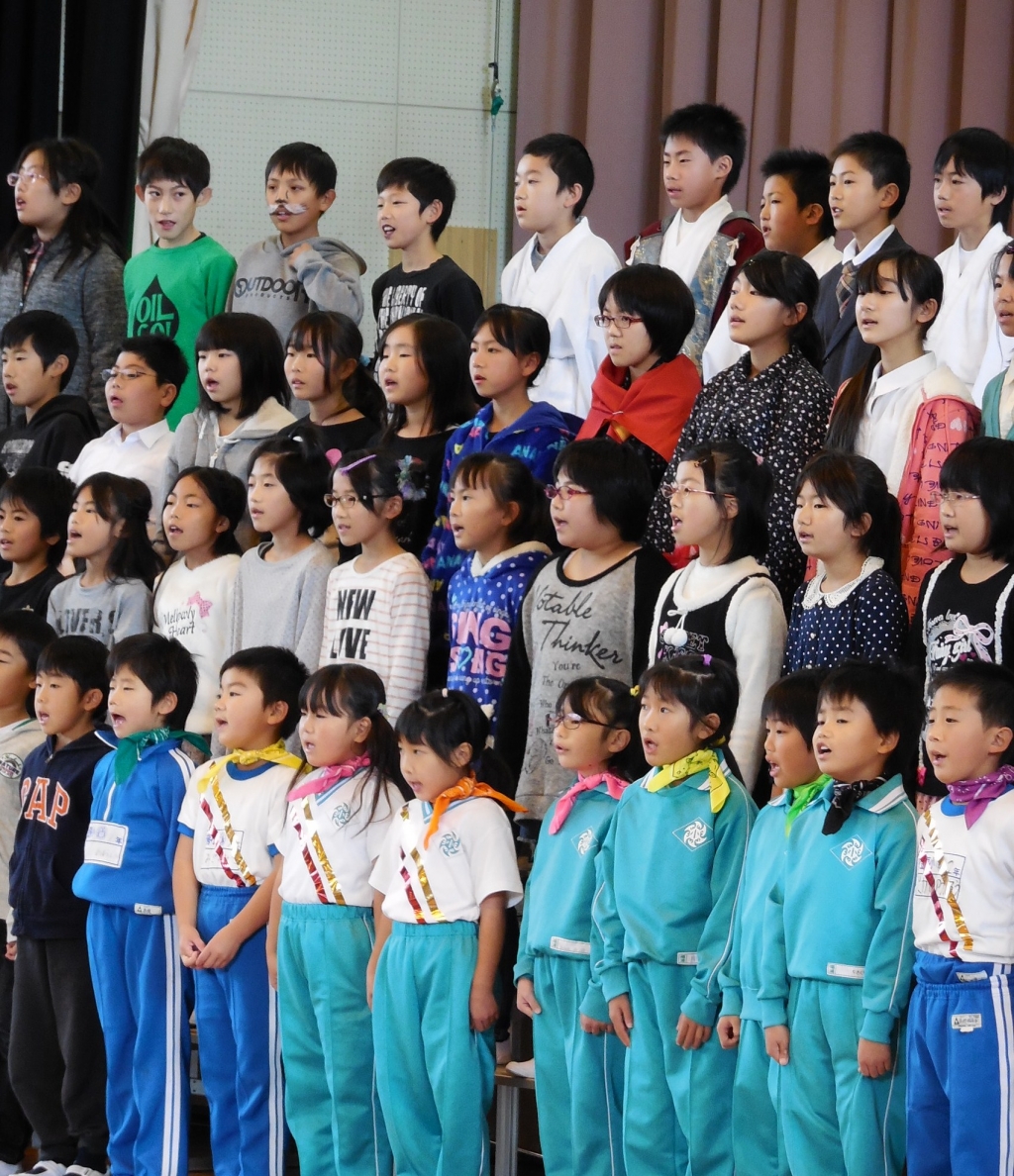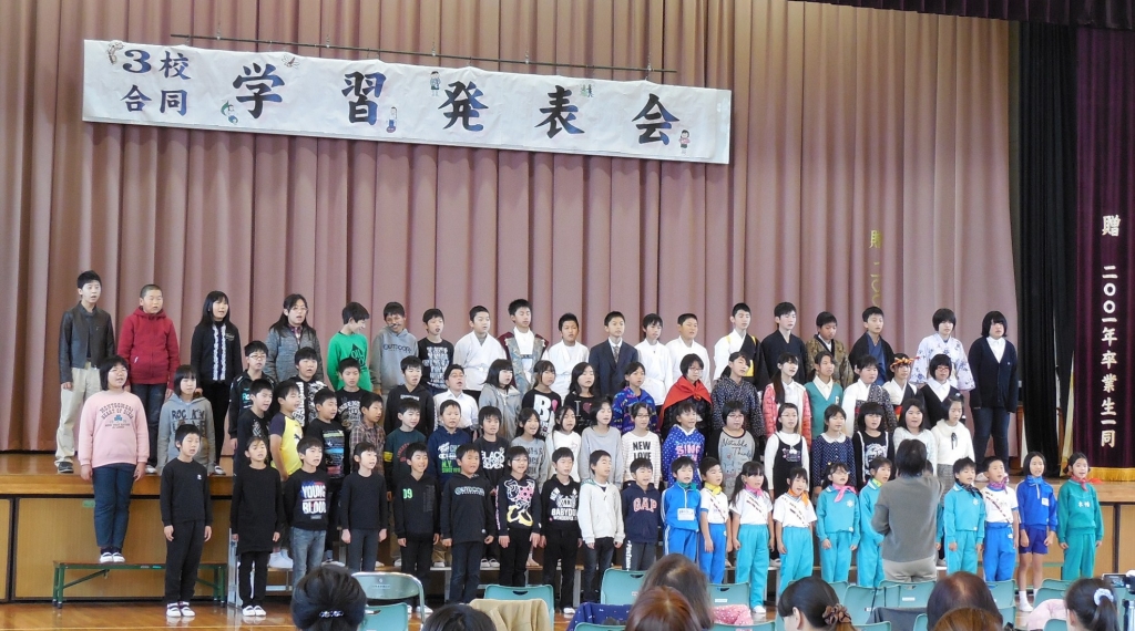 3校合同になって、2回目の学習発表会。仮設体育館が完成しつつあり、この体育館で演じるのも、これで最後になります。
