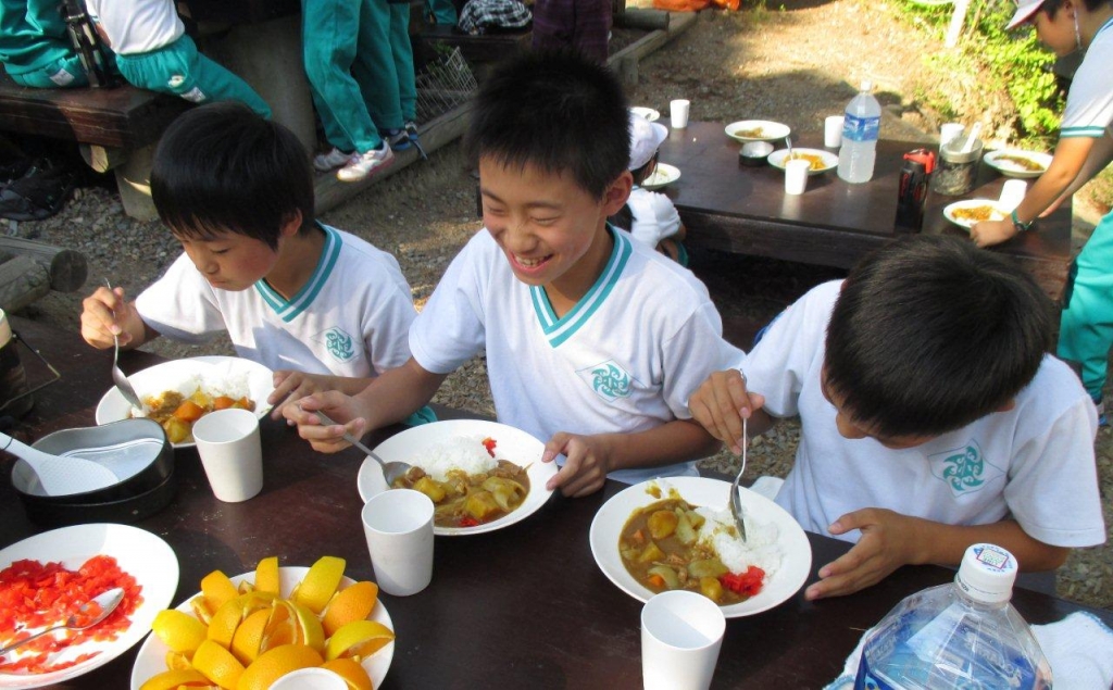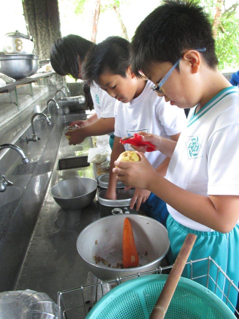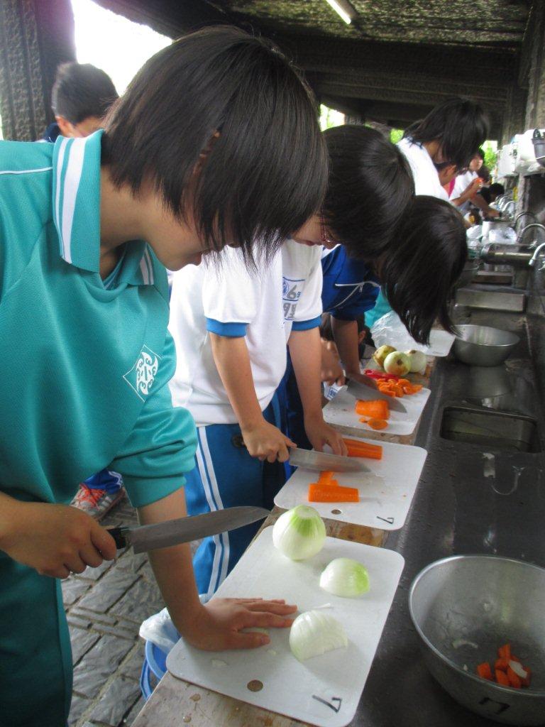 験。手際よく野菜の皮をむき、切り、炒め、おいしいカレーができあがりました。