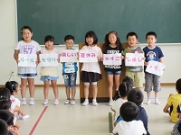 その後,生徒指導の担当と安全指導の担当から楽しい夏休みにするために守ることについてのお話がありました。その話を,子どもたちは真剣に聞いていました。1学期は4校合同運動会や陸上競技大会など大きな行事がありました。その行事を通して,31名の子どもたちは一回りも二回りも大きく成長し,その瞳の輝きも増していました。