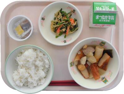 今日の献立:麦ご飯 おでん ほうれん草のきなこ和え 納豆 牛乳