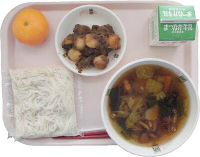 今日の献立:なめこうどん 冬至かぼちゃ みかん 牛乳」