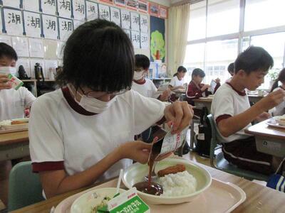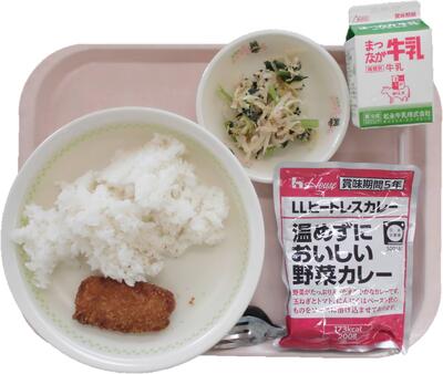 今日の給食は、万が一のために、学校や給食センターに備蓄している『ヒートレスカレー』を使った献立です。