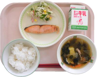 今日の献立:ご飯 サツマイモの味噌汁 鮭の塩焼き アントシアニンサラダ 牛乳