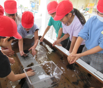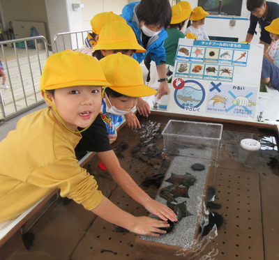 タッチプールでヒトデやウニなどに触ったり、海の生きものや環境問題について教えていただいたりしました。