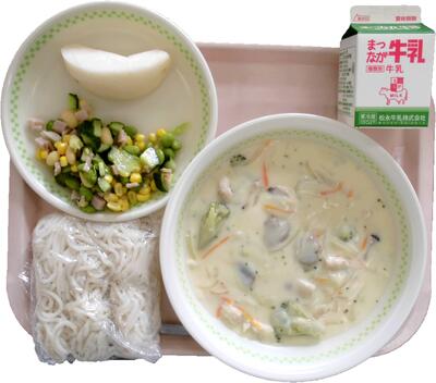 今日の献立:クリームスパゲッティ まめまめサラダ なし 牛乳