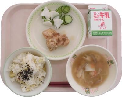 「今日は『日本型食生活の日』の献立です。主食は、ほくほくとした「栗」と「さつまいも」が入った『栗いもごはん』です。「栗」は秋の味覚の代表としてもあげられます。栄養豊富でおいしい栗は、古くから食べられていて、日本では、縄文時代の遺跡からも発掘されています。栗にはエネルギーの源となる炭水化物、体の免疫力をアップさせるビタミンCや食物せんい、疲労回復効果のあるビタミンB1など、一粒に栄養素がバランスよく含まれています。「さつまいも」も秋が旬の食べ物です。秋はおいしい食べ物が収穫される季節です。バランスのよい食事をしっかり食べて、実りの秋を楽しみましょう。」