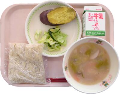 今日の献立:チャンポンメン キャベツとキュウリのレモン漬け 焼き芋 牛乳