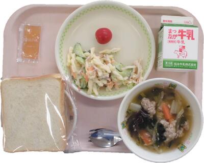 今日の献立:食パン 県産桃ジャム 手作り肉団子スープ マカロニサラダ ミニトマト 牛乳