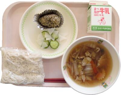 今日の献立:肉うどん 大根の浅漬け ごまおはぎ 牛乳