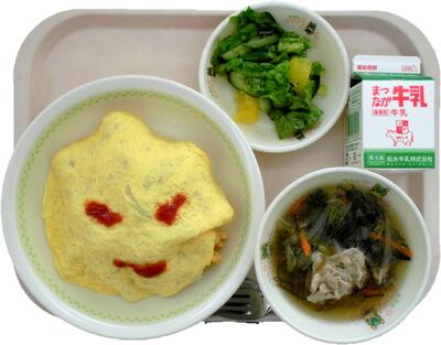洋食屋さんの定番メニューで日本人が大好きなオムライスは、オムレツでライスを包むから「オムライス」と名付けられた和製英語です。「オム」とは、薄焼きのたまご料理という意味のオムレットからとられたものです。今日は、トマトケチャップで文字や絵を描いて楽しく食べましょう。」