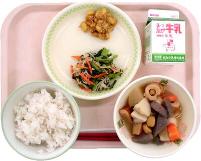 「かむことの良さを表すことば『ひみこのはがいーぜ』から、「が」についてお話しします。「が」は「がんを防ぐ」の「が」です。だ液には、がんを引き起こす物質のはたらきをおさえるはたらきがあります。それは食べ物を30秒くらいだ液につけることで、効果があると言われています。よくかむとだ液がたくさん出てくるので、食べ物がだ液と混ざりやすくなります。そうすることで、食べ物が体にとってよい状態で吸収されるので、体を健康にすることができます。今日は、かみかみ献立です。「豆みそ」をごはんと一緒によくかんで食べましょう。」