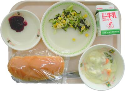 今日の献立:コッペパン 相農のぶどうジャム ホワイトシチュー ビタミンたっぷりサラダ 牛乳