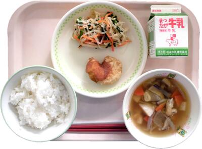 今日の献立:ご飯 けんちん汁 鶏肉の柚味噌掛け ニラのおひたし 牛乳