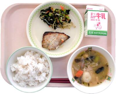 今日の献立:麦ご飯 味噌すいとん アジの塩麹焼き 海苔和え 牛乳