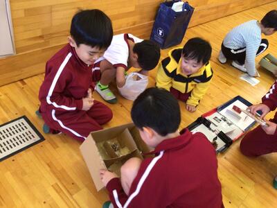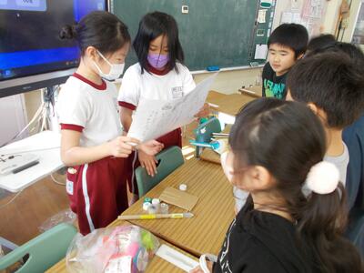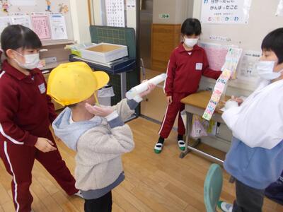 2023年12月20日 15時26分先日、1年生が、2年生の「おもちゃパーティー」 に招待してもらいました。1年生は、2年生からおもちゃの作り方の説明を聞いて遊んでもらいました。2年生も楽しみながら、説明の仕方や、お客さんを喜ばせる工夫を学ぶことができました。そのお返しとして、今度は1年生が「あきのおもちゃランド」を開き、2年生に来てもらいました。2年生の真似をしてお店を開き、みんなで楽しむことができました。