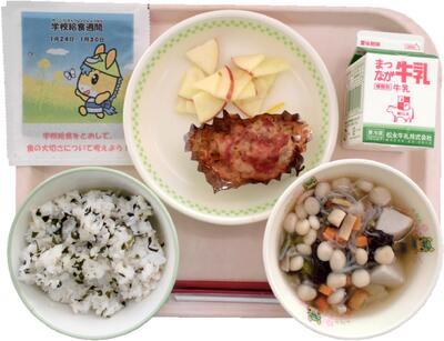 2024年1月25日 12時35分今日は、学校給食週間の2日目です。今日は、会津地方の郷土料理『こづゆ』の登場です。お正月や結婚式などのお祝いの時に食べられます。ホタテの貝柱を水で戻した物をだし汁で使うのが特徴です。材料は、山の産物の「きくらげ、しいたけ」、里の産物の「さといも、にんじん」、海の産物の「ホタテの貝柱」です。こうした「山の幸」「里の幸」「海の幸」の貯蔵できる食材や乾物などの食材を必ず膳に入れるところが、会津の食の特徴です。ホタテの貝柱のだしがきいていて、とても上品な汁物です。会津藩のごちそうを味わってみましょう。また、副菜の『ゆずりんご』は、フルーツ王国福島を代表する冬の果物「りんご」を使ったデザートです。