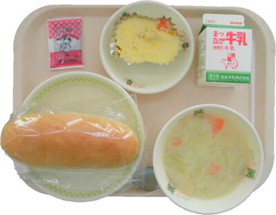 今日の献立:コッペパン 大豆チョコクリーム 豆乳スープ カラフルオムレツ 牛乳