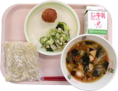 今日の献立:広東麺 海藻サラダ サーターアンダギー 牛乳