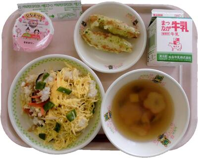 今日の献立:ちらしずし すまし汁 笹かまの磯辺揚げ 桃ゼリー 牛乳