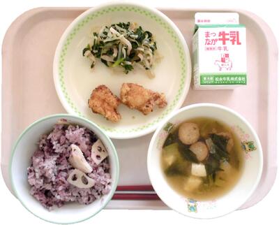 今日の献立:絆ごはん 小松菜の味噌汁 鶏肉の唐揚げ ニラともやしの辛子和え 牛乳