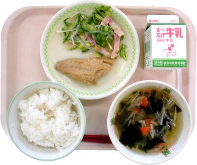 2024年3月12日 12時35分今日は「ふくしま健康応援メニュー」の給食です。健康応援メニューは『切り干し大根とほうれん草のすまし汁』です。食物せんいがたっぷりで、食べ応えのあるすまし汁です。そこで今日は、「食物せんい」についてお話しします。食物せんいは、食べ物の中で消化吸収されずに残る成分で、そのまま体の外に出ます。そのとき、多くとり過ぎた脂肪なども一緒に体の外に追い出すため、さまざまな病気の予防になります。また、お腹いっぱいに感じさせて食べ過ぎを防いだり、肥満の予防にも効果があります。食物せんいは、野菜やきのこ類、海藻類、豆類など、かみごたえのある食べ物に多く含まれています。今日のすまし汁には、干すことで、栄養も旨味も増した切り干し大根が使われています。すまし汁を味わってみましょう。