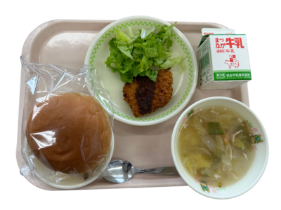 本日の献立:まるパン 春野菜スープ グリーンカールレタス かじきカツ 牛乳