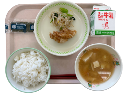本日の献立:ご飯 じゃがいもとえのきの味噌汁 野菜の和え物 鶏肉の照り焼き 牛乳