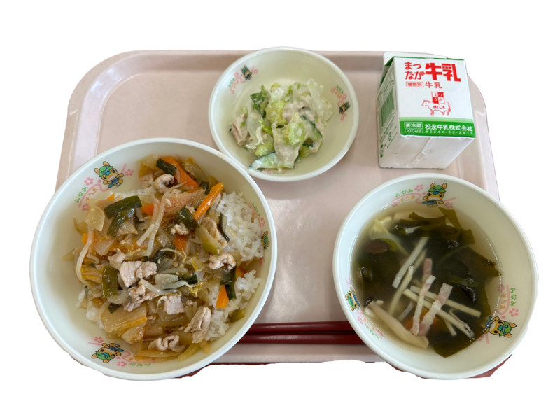 2024年4月22日 14時03分今日は『野菜』についてお話をします。給食のおかずには、いろいろな種類の野菜が入っています。今日の「豚キムチ丼」には、もやし、白菜 、玉ねぎ、にんじん、にら、たけのこ、しょうが、にんにくと8種類の野菜が使われています。野菜をしっかり食べて、病気 に負けない健康な体をつくっていきましょう。
