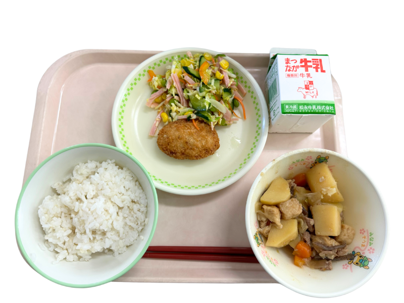 2024年4月26日 09時27分 給食では、毎日1 本牛乳がついています。牛乳は、成長期にもっとも体に必要なカルシウムが多く含まれています。さらにたんぱく質も含まれているので、他の食品よりも体にカルシウムが吸収しやすい飲み物です。給食で、「いただきます」のあいさつをしたら、まずはひと口飲んでから、おかずやごはんを食べるようにしましょう。また、飲まないで残すことがないように、ひと口でも多く飲む習慣をつけましょう。 本日の献立:麦ごはん 肉じゃが いかメンチ コーンとハムのサラダ 牛乳