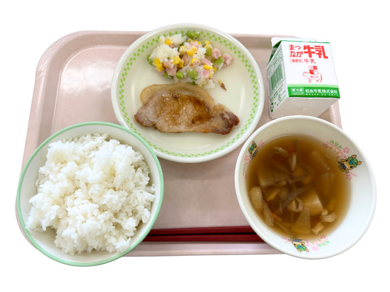 本日の献立:ご飯 けんちん汁 豚肉の生姜焼き 和風ポテトサラダ 牛乳