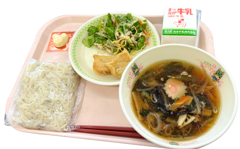 本日の献立:中華麺 醤油ラーメン たこナゲット 中華サラダ 型抜きチーズ 牛乳
