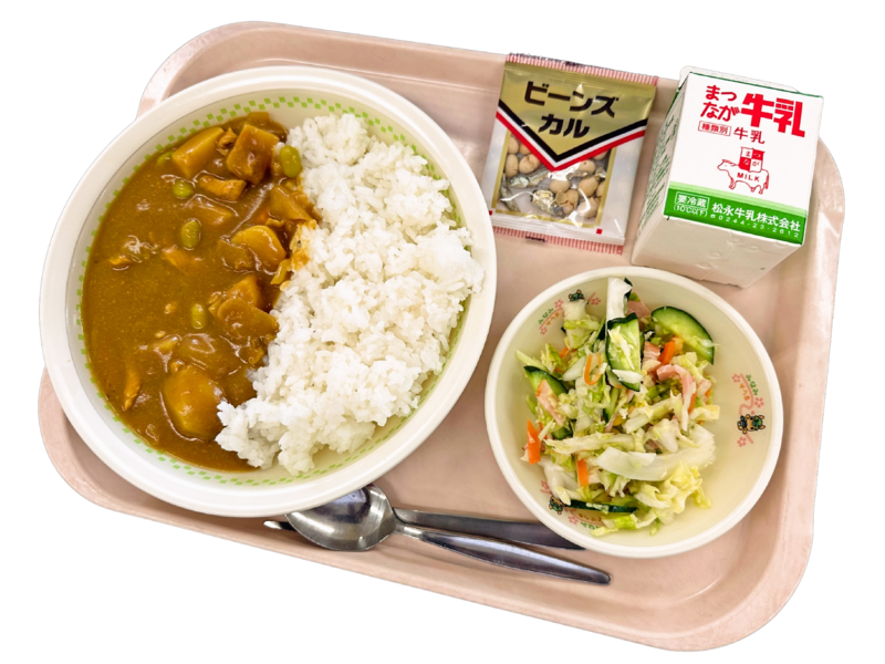 今日の献立:チキンカレー 春キャベツのサラダ ビーンズカル 牛乳