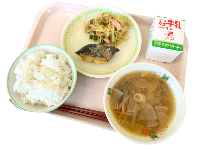 本日の献立;ご飯 豚汁 ほっけの唐揚げ もやしのカレー和え 牛乳