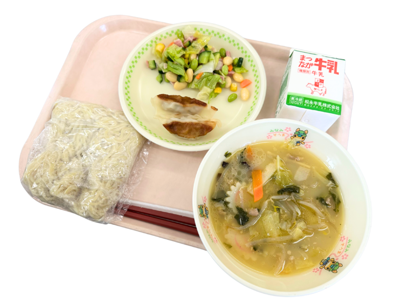 本日の給食:豚骨ラーメン 肉餃子 豆々サラダ 牛乳