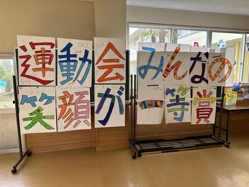 2024年5月16日 08時43分今年の運動会のスローガンは「運動会 みんなの笑顔が一等賞」に決まりました。勝っても負けてもみんなが全力を出し切って笑顔で運動会を終われるようなそんな気持ちが込められています。各クラスで協力し合い、スローガンの看板も作りました。いよいよ運動会まであと2日です。