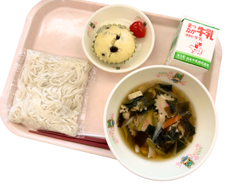 本日の献立:わかめうどん チョコチップ蒸しパン ミニトマト 牛乳