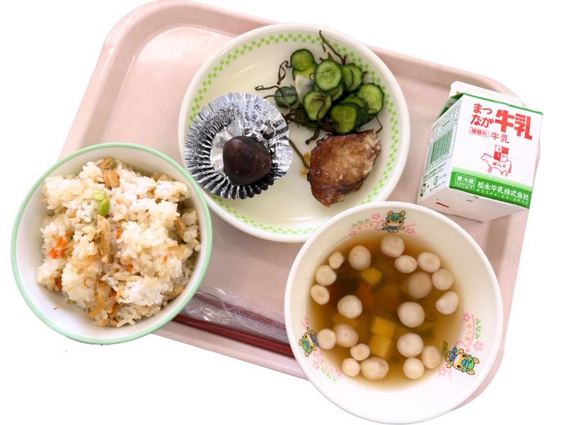 2024年5月23日 13時42分 今日は「いざ、出陣」メニューです。今年は5月25・26・27日が相馬野馬追です。国の重要無形民俗文化財に指定されています。出陣の儀式「三献の儀」には、打ちアワビ、勝ち栗、昆布の三品をそろえることが昔から慣習として守られてきました。今日の給食はアワビの代わりにホタテの貝柱を入れたごはん、塩昆布入りのきゅうりづけ、それに勝ち魚 である「かつおの揚げ煮」と「勝ち栗」の出陣メニューです。相馬の野原を颯爽と走る騎馬 に思いをはせながら、よくかんでおいしくいただきましょう。